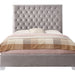 Create your sophisticated, luxurious master retreat with the Lacey bedroom collection. Luscious velvet-like fabric in silver gray is detailed with chrome trim and deep button tufts creating elegant softness. Transform your home with the stylish details and timeless beauty of Lacey!