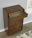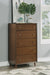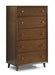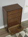 Offering the quintessential mid-century modern profile with clean lines, chamfered edges, and tapered, splayed legs, this drawer chest is designed to coordinate with the different Ludwig beds in the collection. A warm, walnut finish adorns the Ludwig drawer chest, which offers five roomy drawers accented with round, brushed brass pulls. The upper drawer is felt-lined to keep contents protected and in place. Timeless design and high-quality construction ensure the Ludwig drawer chest can be enjoyed by future generations, while a smaller-size scale allows it to fit perfectly in any size bedroom.