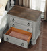 Vintage cottage style meets modern convenience with the Plymouth nightstand. Outfitted with three roomy drawers on premium ball-bearing glides to store all your bedside essentials, this nightstand also features integrated power to keep unsightly cords concealed and USB ports to charge your devices. A distressed graywash finish is contrasted with antique gunmetal pulls, while paneled accents and turned bun feet add to the unique vintage charm.