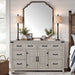 The Alexandria Dresser from Bridgevine Home delivers a Modern Farmhouse-Industrial-Rustic style trifecta. Skillfully crafted from Poplar Solids and Birch Veneers, this Dresser is finished in Mountain Mist with Forged Iron rivets and hardware. Featuring six drawers and two doors, this dresser will provide ample storage for clothing and jewelry and make a stylish addition to your main or spare bedroom. Fully Assembled upon arrival, this piece from Bridgevine Home is ready to unbox and enjoy.