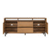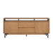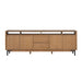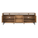 Sophistication meets rustic, industrial charm with the Millwork entertainment center. Seamlessly blending high-contrast materials and finishes in perfect harmony, this piece makes a captivating statement in any living space. A textured steel frame is highlighted by warm copper undertones, while a distinctive 76” wood top exudes character with natural knots, subtle saw marks and a cerused finish that accentuates the rich umber wood grain. Above the drawers and cabinets, open shelving offers both form and function, perfect for displaying curated décor, housing media components, or keeping everyday essentials within reach while maintaining an airy, balanced silhouette.