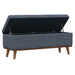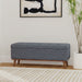 For a cool blend of modern style and practical function, look to the Rory storage ottoman. With its dark walnut-toned solid wood exposed frame and tapered legs, this piece brings a solid beat to any room. The tufted top, upholstered in dark blue fabric with flecks of gray, adds just the right touch of sophistication. Hidden storage keeps your essentials under wraps, while its classic nod to midcentury designs add just the right tune to your living room, entryway, or bedroom.