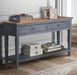 The Americana 60 inch Sofa Table boasts a refreshing coastal twist on traditional style. Skillfully crafted from Rubberwood Solids and Birch Veneers, the subtle distressing and Corduroy Blue finish give this Entry Table an updated look with a timeless heirloom feel. Featuring two drawers and one lower shelf, this Console Table is the ideal spot to showcase a table lamp and home décor favorites whether placed behind your sofa or in your entryway. Just like Baseball, Apple Pie and Rock & Roll, the Americana Sofa Table will become a beloved favorite in your home. Fully assembled upon arrival, this piece from Bridgevine Home is ready to unbox and enjoy.