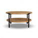 Sophistication meets rustic, industrial charm with the Millwork round coffee table. Seamlessly blending high-contrast materials and finishes in perfect harmony, this table makes a captivating statement in any living space. A textured steel frame is highlighted by warm copper undertones, while a distinctive wood top and lower shelf exude character with natural knots, subtle saw marks and a white cerused finish that accentuates the rich umber wood grain.