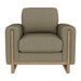 Sutton Place sets a tone of ease and elegance, pairing sculptural details with a relaxed contemporary feel that’s all about balance. Upholstered in olive green chenille, the fabric reflects light with a soft, shifting luster. Loose, reversible back cushions and sinuous spring seating offer easy, supportive comfort, while accent pillows in textured boucle blend creamy off-white and warm beige for added softness and contrast. A light caramel wood trim wraps the base, traces the track arms, and continues into open sleigh legs that add a refined architectural touch. Casual yet composed, Sutton Place fits seamlessly into living rooms that mix sophistication with a laid-back feel.