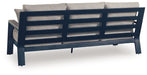 Easy-breezy beauty, made to withstand the elements. This outdoor sofa makes a serene statement on your deck or patio with its soothing shade of blue and contrasting wood-look arms. A cushioned seat keeps you comfy as you lounge. And with durable materials providing added longevity, this sofa is a smartly-stylish addition to your outdoor oasis.